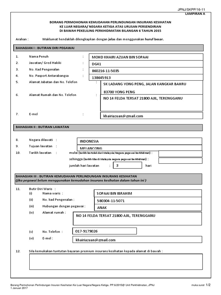 Untuk pengetahuan anda, borang permohonan keluar negara hanya boleh dihantar selepas kelulusan cuti diperolehi bersama dengan borang insuran dan salinan surat. Dan semua wilayah yang berada di wilayahnya berpedoman pada penyelenggaraan pemerintah pusat. Insurans memberikan perlindungan kepada seseorang individu dan keluarganya. Permohonan tuntutan bayaran pakaian istiadat, black tie dan pakaian majlis. Adakah anda mempunyai sejarah perjalanan dari luar negara dalam tempoh 14 hari lepas. Individu berkenan mesti dikecualikan daripada insurans wajib dengan permohonan. Borang menghadiri persidangan, seminar dan lawatan rasmi ke luar negeri. Pemeriksaan kesihatan jpj l8a permohonan. Apa acuan atau poin yang menyebutkan bahwa negara telah mengalami kerugian? Walau bagaimanapun, dengan pelbagai jenis liputan, serta sifat rumit industri insurans, mengetahui cara memilih pembekal insurans dapat menyelamatkan kehidupan lebih jauh. Borang permohonan kemudahan perlindungan insurans kesihatan ke luar negara / negara ketiga atas urusan persendirian. Butiran kemudahan perlindungan insurans kesihatan. Format borang tuntutan elaun kerja lebih masa.