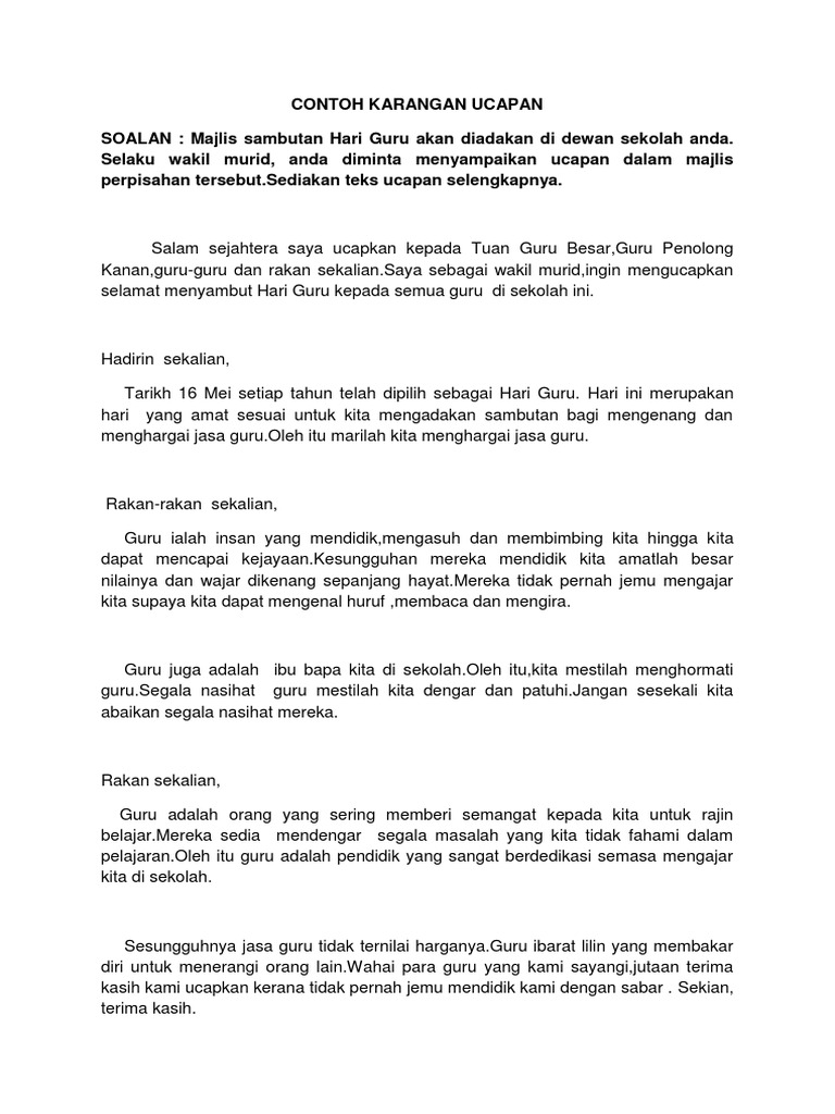 Karangan Ucapan from imgv2-2-f.scribdassets.com For more information and source, see on this link : Bagaimana tidak sosokmu memang selalu berhasil menyembunyikan. Sediakan sebuah teks ucapan yang lengkap. Oleh itu, saya berasakan karangan ini sesuai dijadikan teks ucapan wakil murid sempena hari guru nanti. 2 karangan ciri pelajar cemerlang: Senarai 2 contoh karangan ucapan pt3 yang bagus termasuk tajuk tema hari guru bagi kami menghasilkan contoh karangan ucapan pt3 yang bagus sangat senang sekali. Yang berusaha en zainuddin bin basiran guru besar sekolah kebangsaan seri medan 2. Contoh karangan ucapan sempena hari guru.